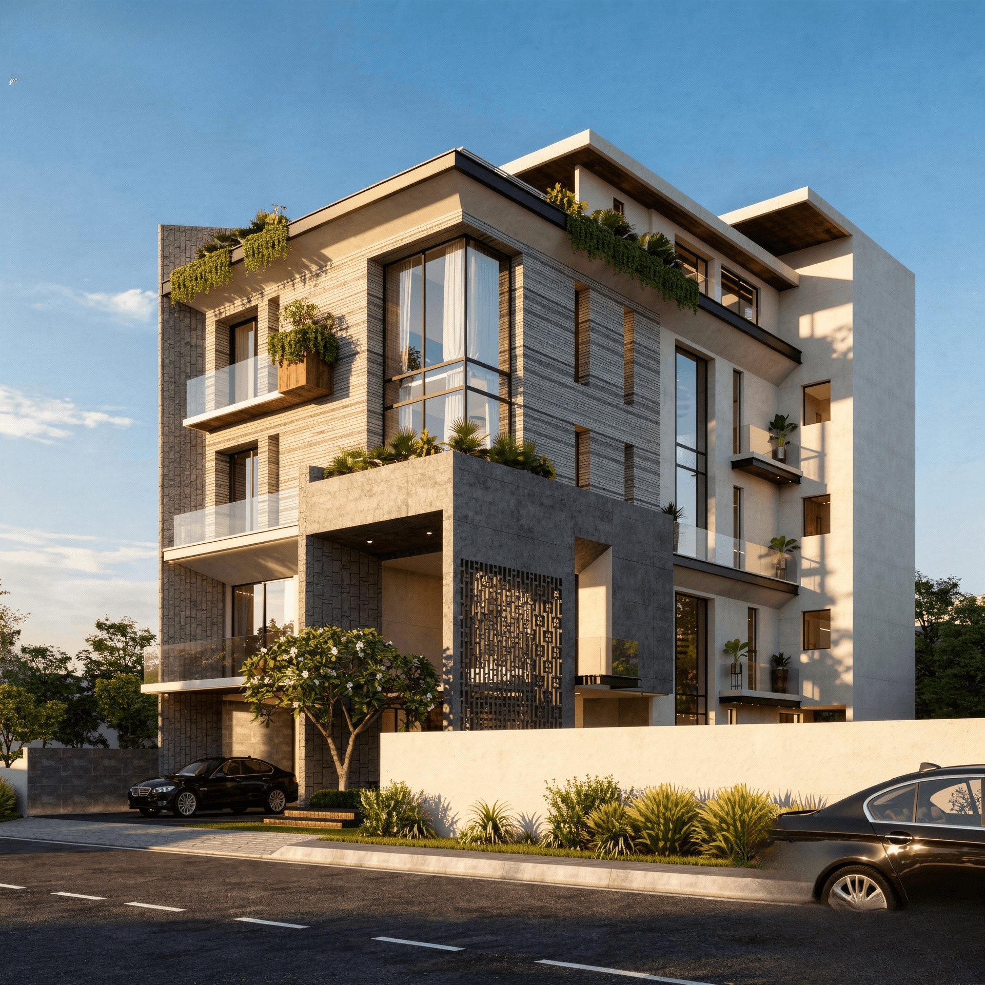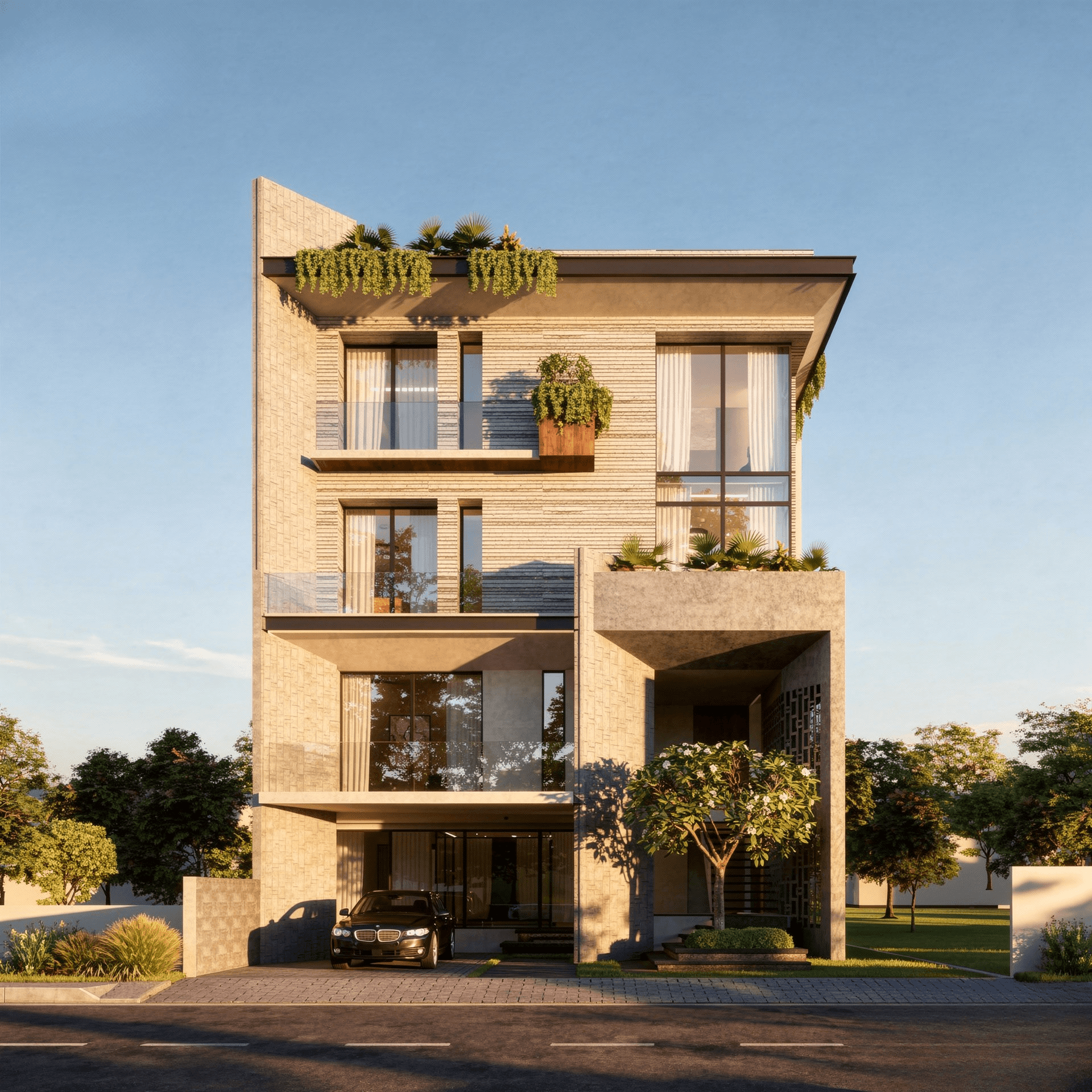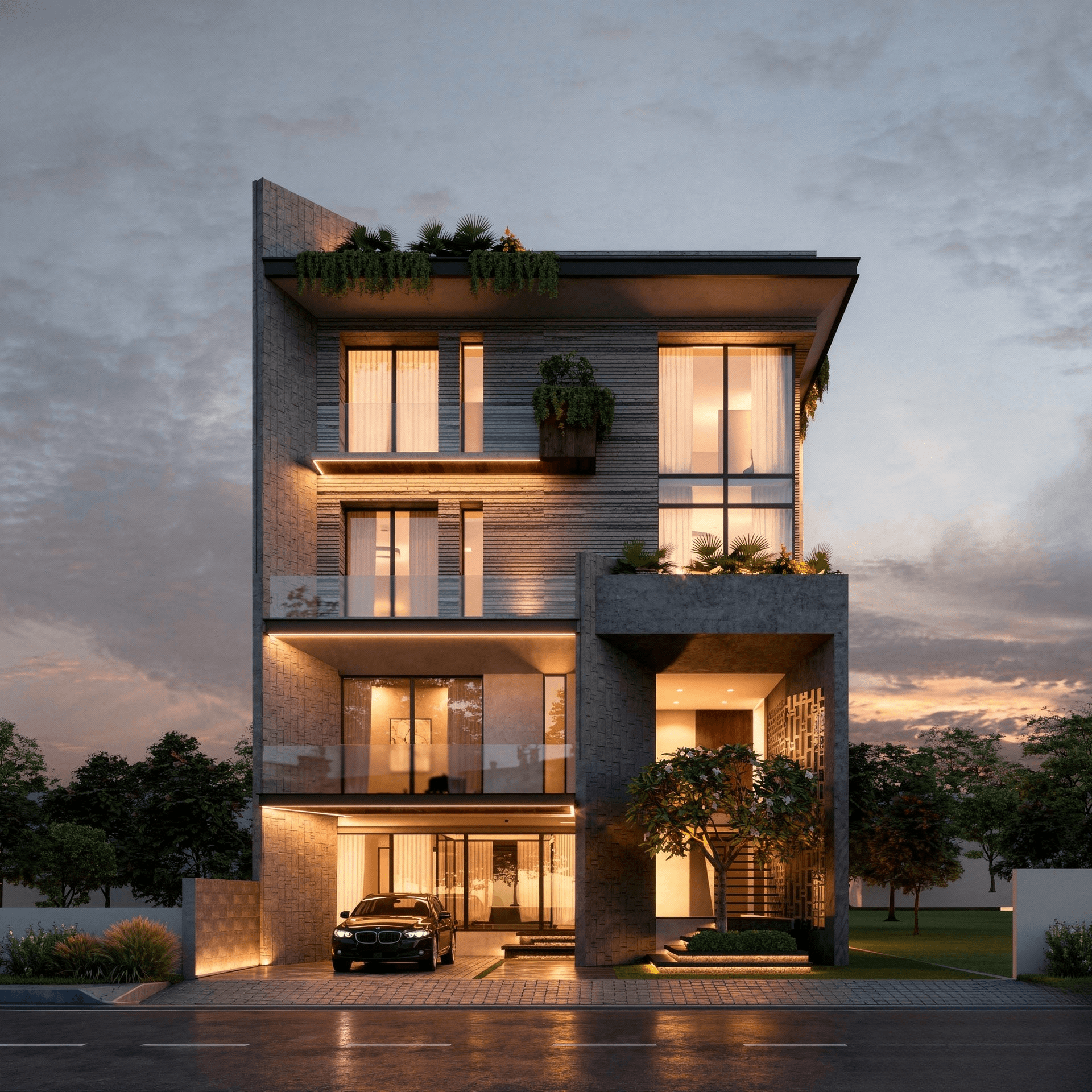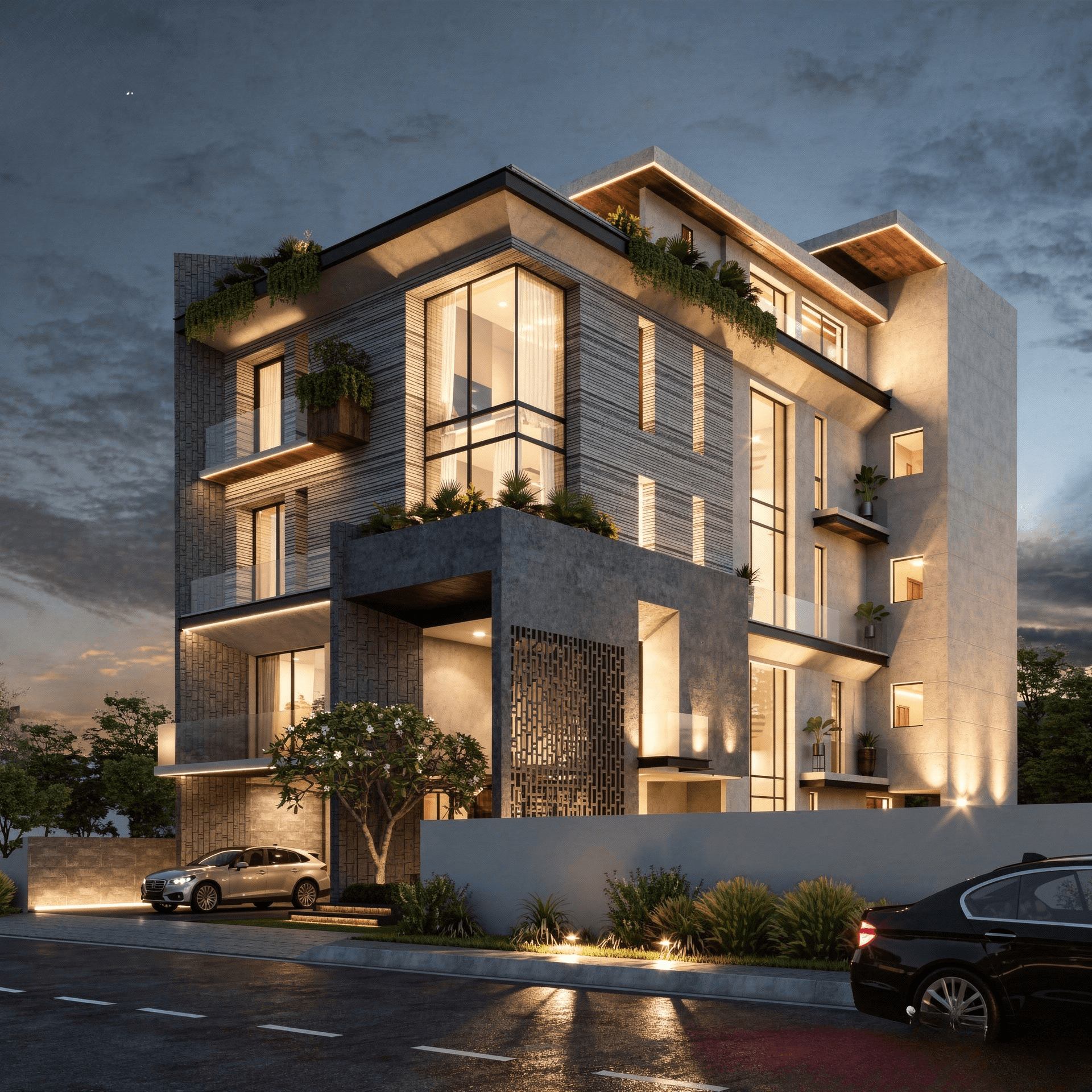 Located in the heart of Noida, Arco Boscoso is a private residence, serving as a striking example of modern architecture, defined by its bold geometric stacking and dramatic cantilevered planes. The design prioritizes a sophisticated modern living experience, where the building's sharp verticality is softened by integrated greenery and a warm, ambient glow. The facade showcases a masterful use of multiple materials, large openings are strategically placed to welcome natural light throughout the day, while at night, recessed linear lighting highlights the structural layers to create a rhythmic urban presence. By blending industrial-inspired textures with soft natural elements, the residence achieves a refined balance of strength and serenity.