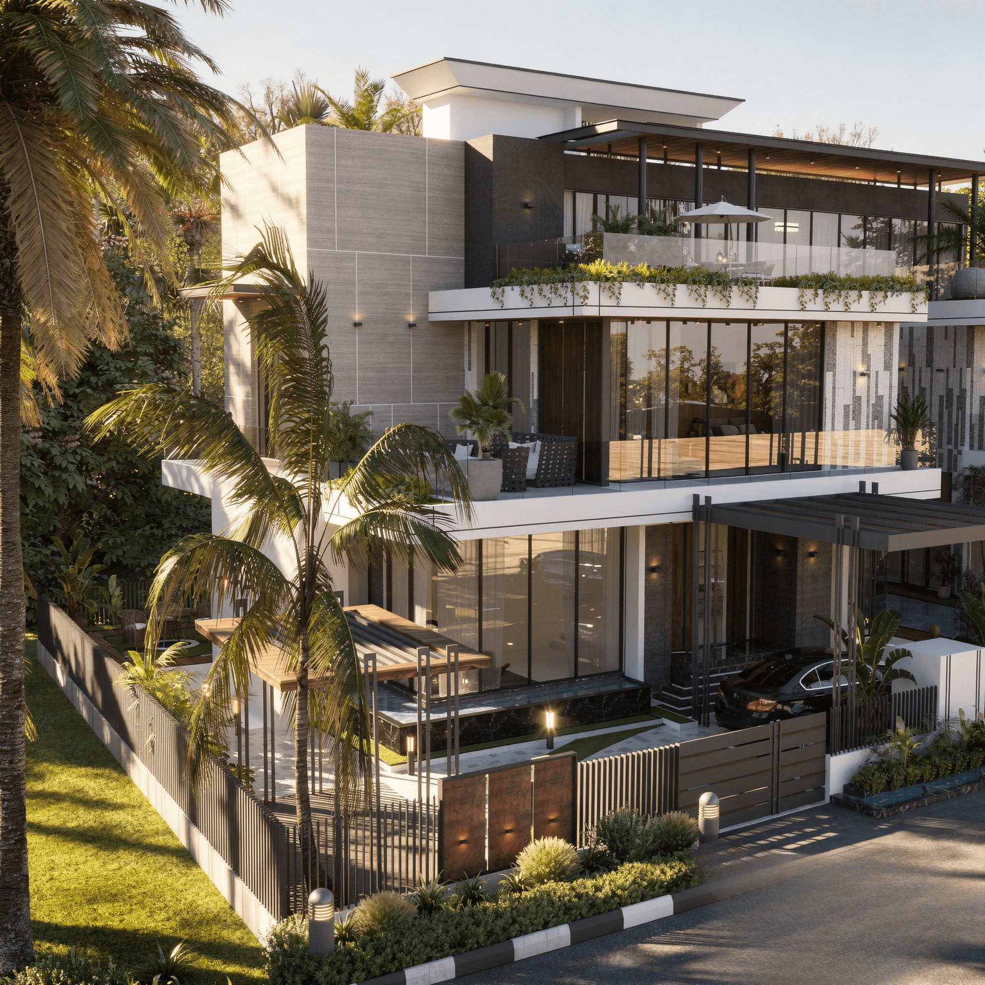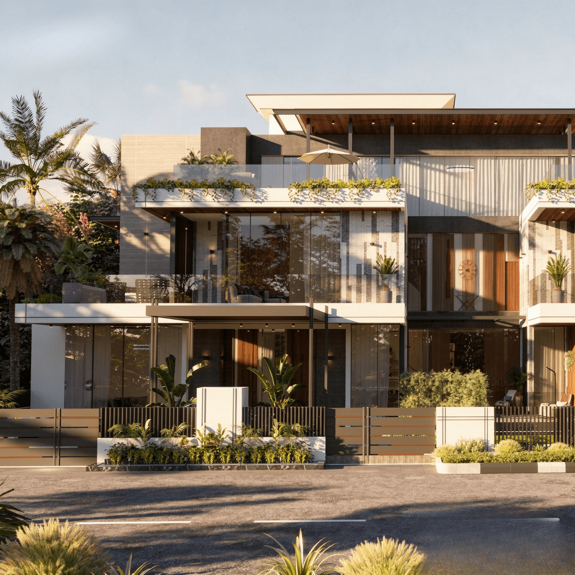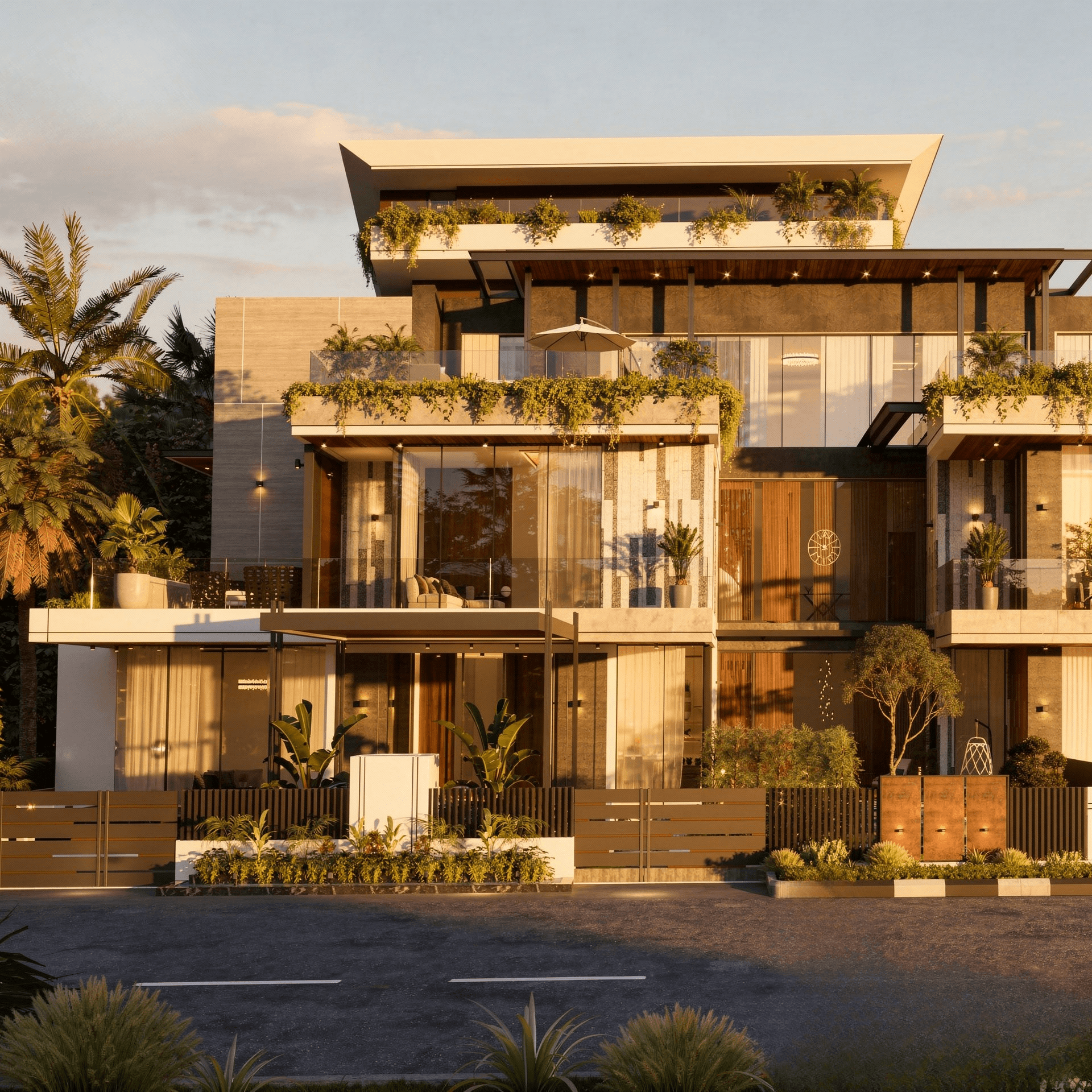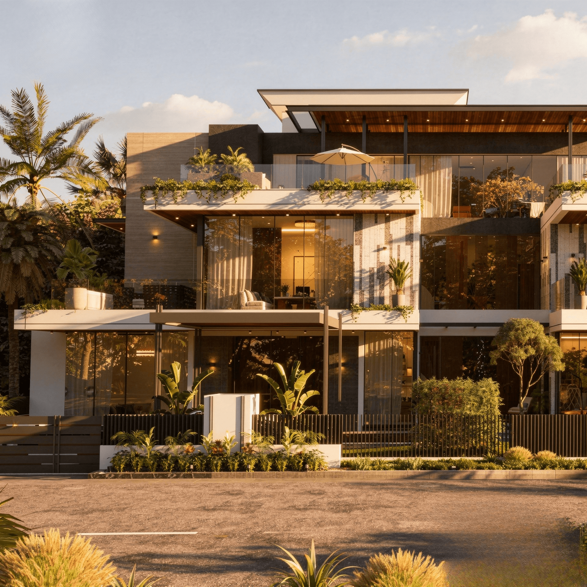 Strategic glass facades and expansive balconies are designed to capture the natural light, effectively blurring the lines between the warm interiors and the lush outdoors.