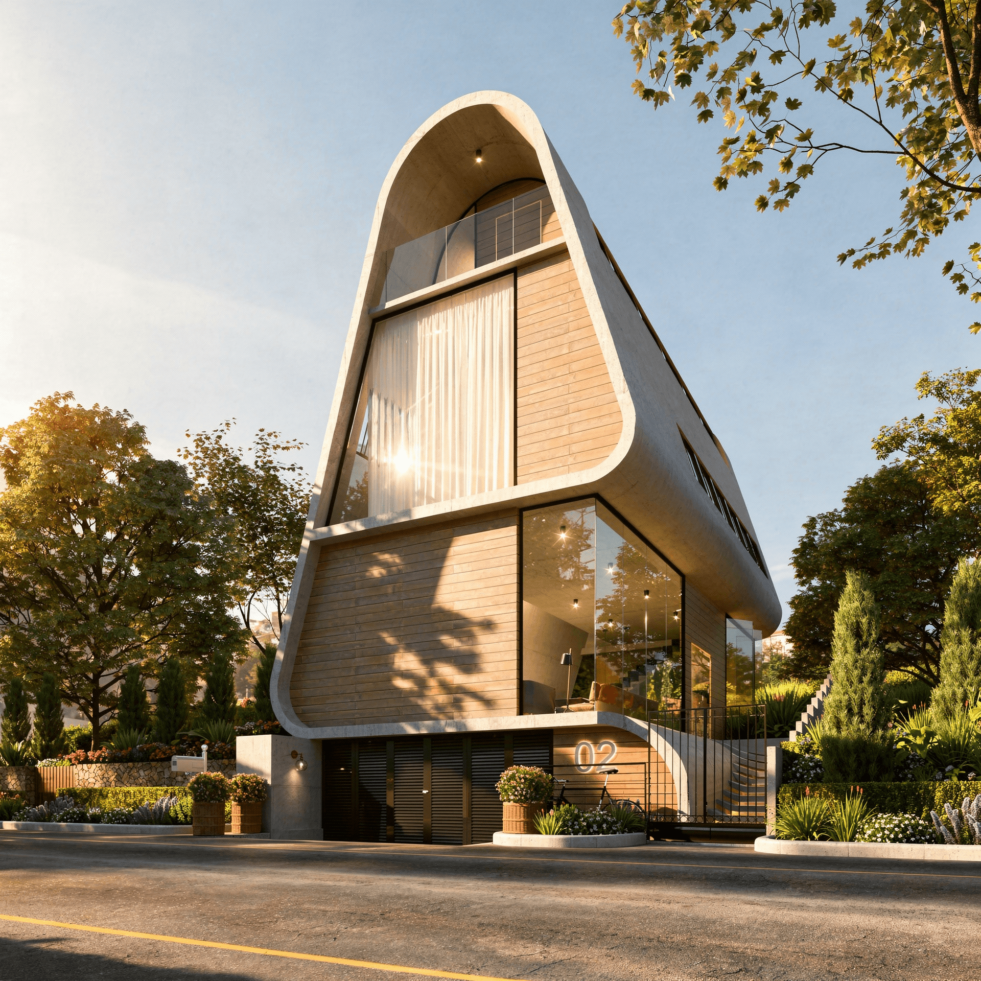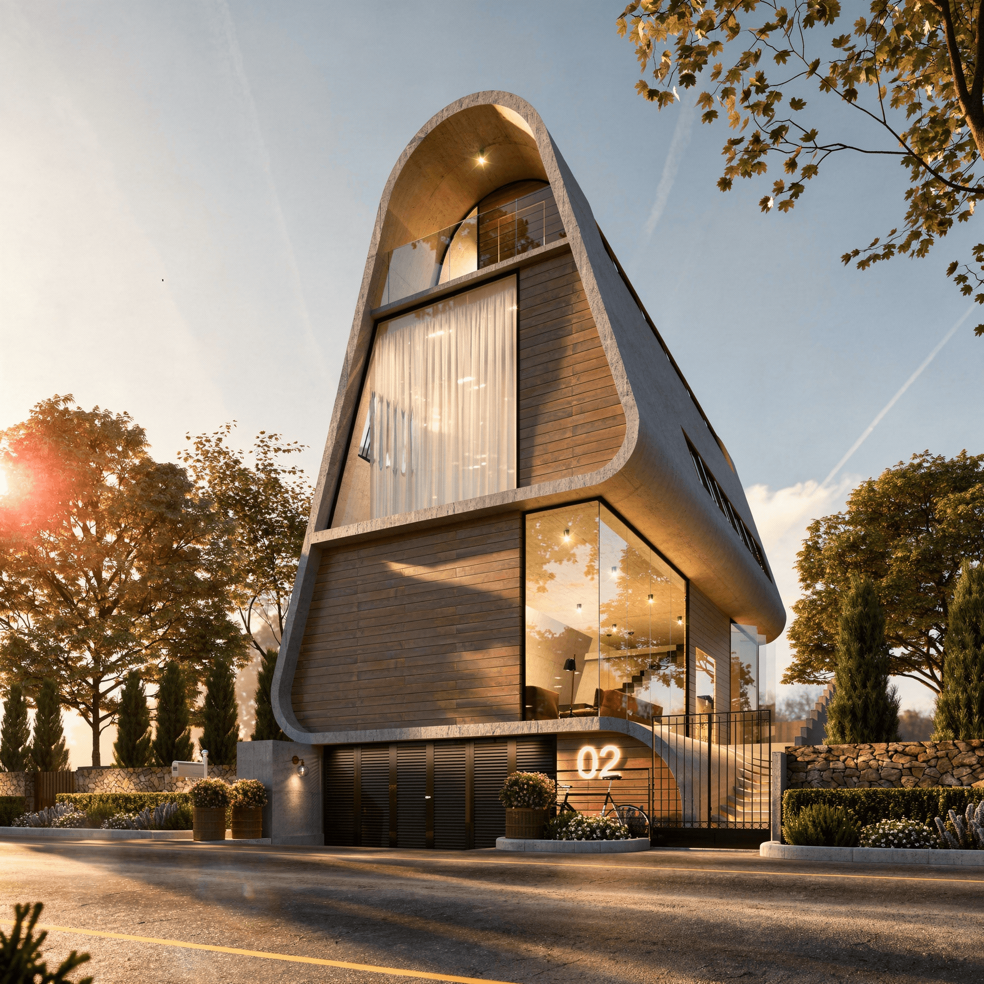 Built for contemporary living, the design features expansive large openings that effortlessly welcome natural light, illuminating the warm timber-clad interiors. This organic form allows the home to breathe, fostering a deep connection with the surrounding greenery while maintaining a sense of minimal grandeur. By blending raw, industrial materials with soft, natural textures, the villa achieves a vertical sanctuary that balances structural innovation with the serene comfort of a modern retreat. Located in the verdant landscape of Bangalore, this villa stands as a sculptural landmark, redefining the boundaries of modern architecture.The residence is defined by its dramatic, continuous concrete