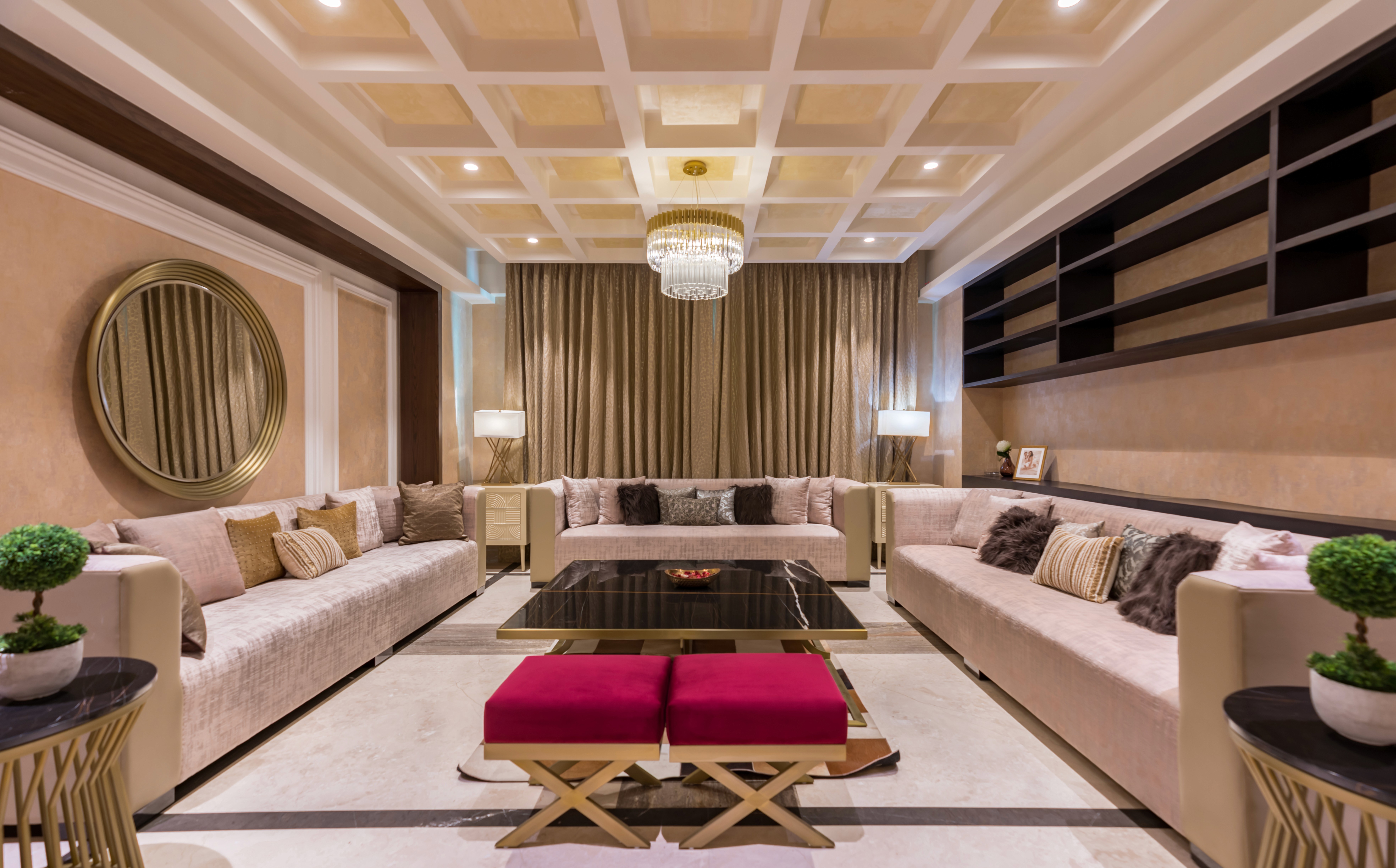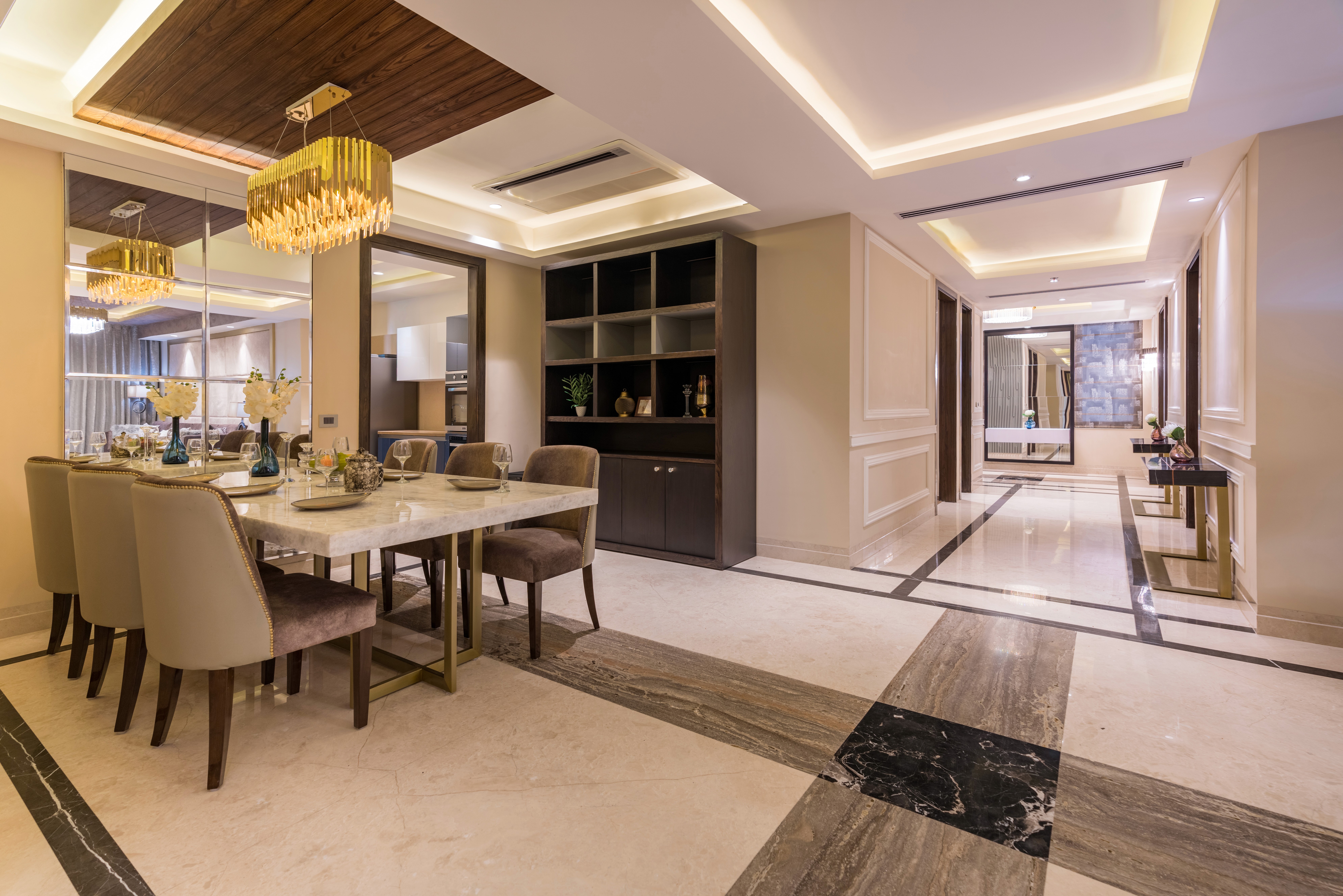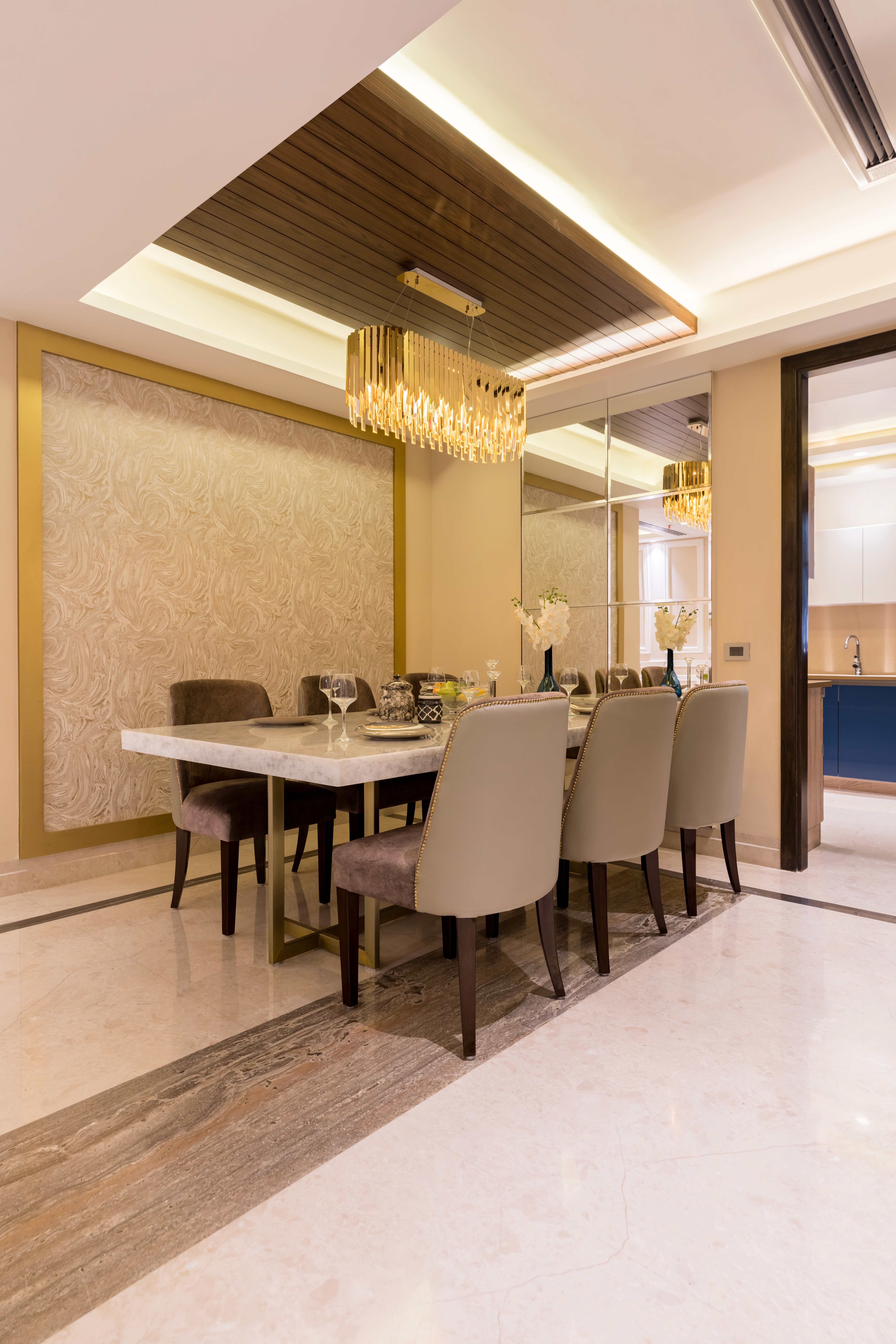 Thoughtfully designed for seamless flow, the villa transitions effortlessly between formal and informal spaces. Elements like a sunken lounge, floating walls, and strategic mirrors enhance openness, while warm wood veneers, soft hues, and gold accents add timeless allure. A double-height dining area connects to an informal lounge, fostering both comfort and refinement, while bedrooms serve as serene, private sanctuaries. Veda Villa adapts to its residents' evolving needs, embodying a harmonious connection to nature, Raipur’s cultural legacy, and the personal stories of its inhabitants.