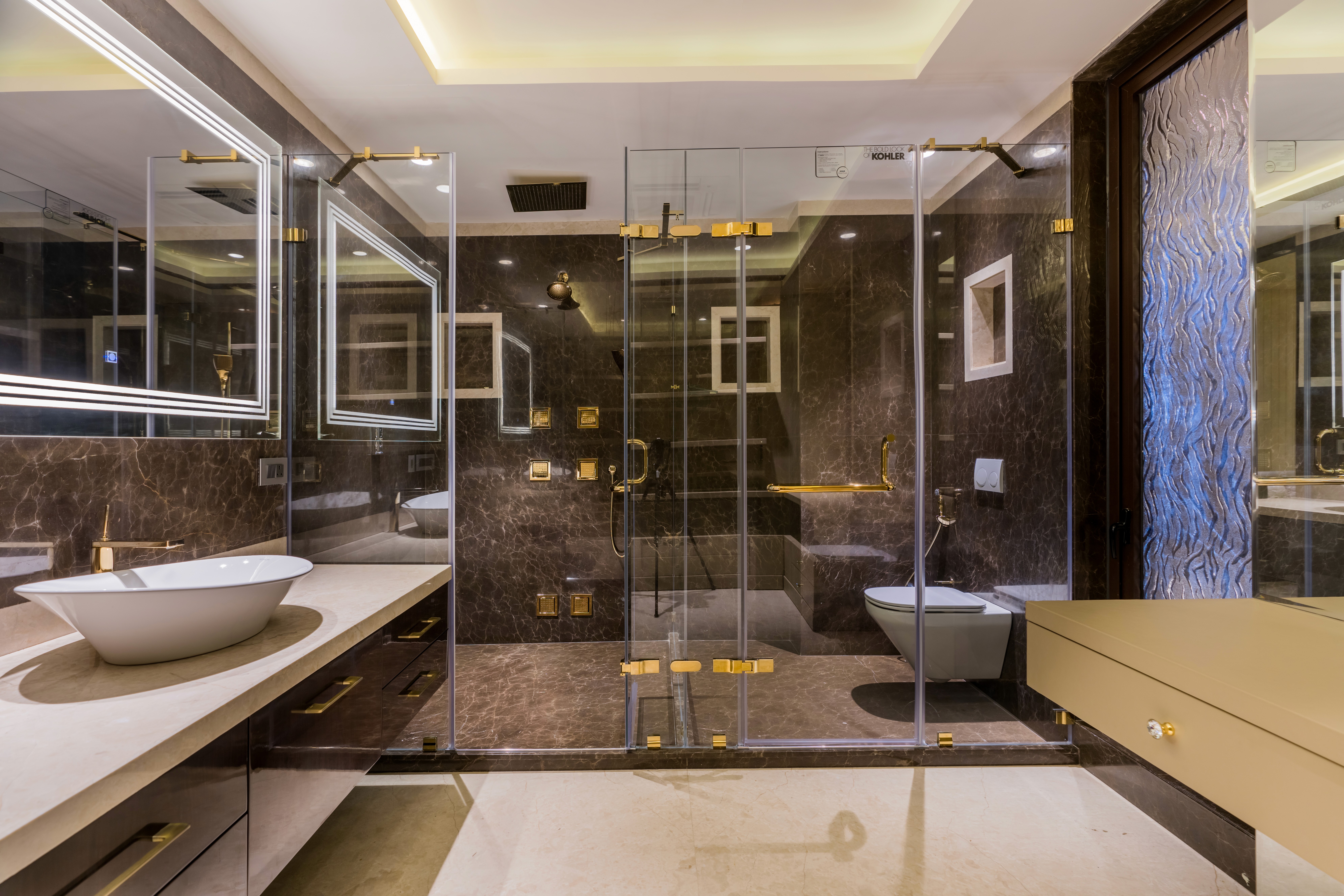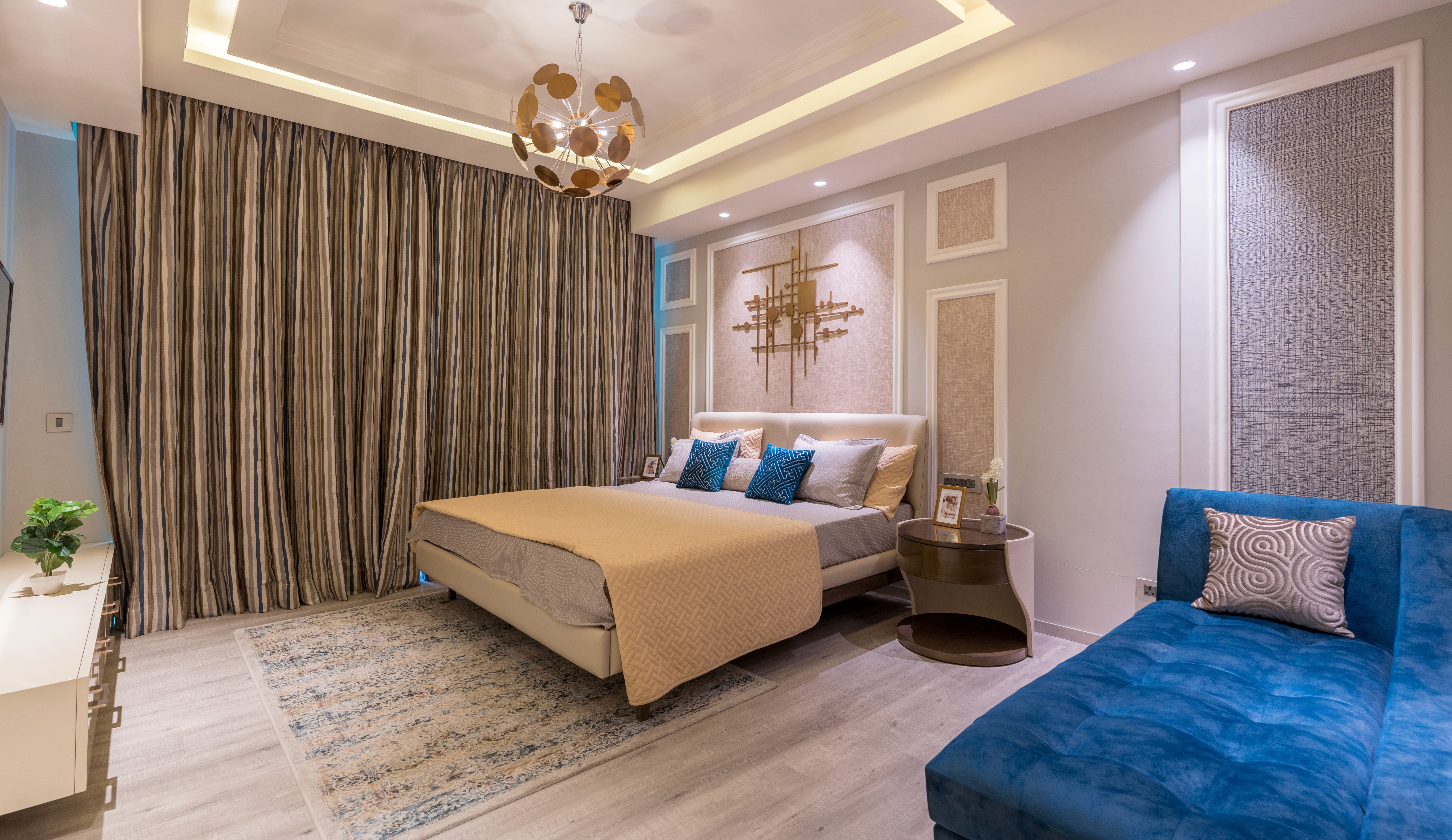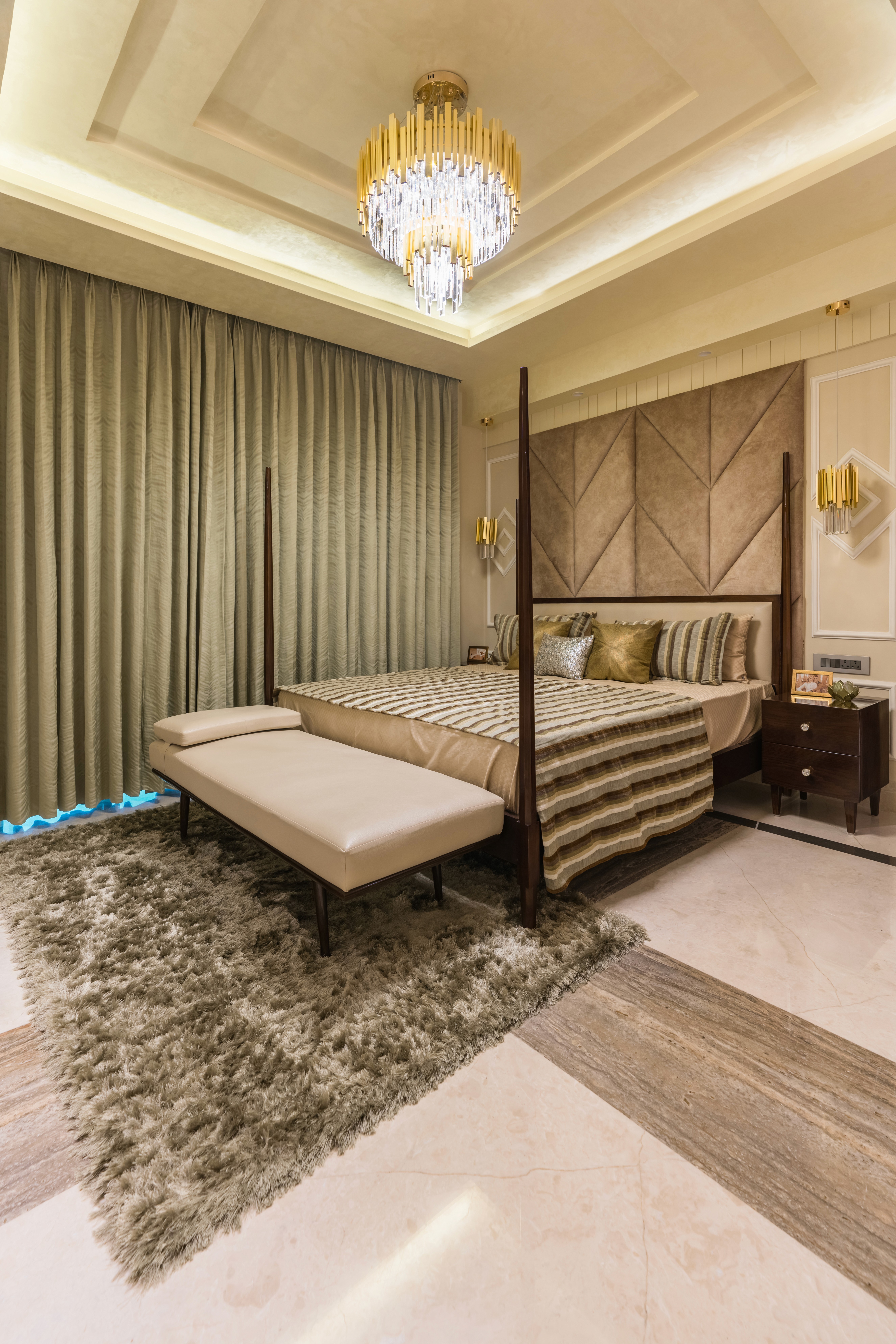 Thoughtfully designed for seamless flow, the villa transitions effortlessly between formal and informal spaces. Elements like a sunken lounge, floating walls, and strategic mirrors enhance openness, while warm wood veneers, soft hues, and gold accents add timeless allure. A double-height dining area connects to an informal lounge, fostering both comfort and refinement, while bedrooms serve as serene, private sanctuaries. Veda Villa adapts to its residents' evolving needs, embodying a harmonious connection to nature, Raipur’s cultural legacy, and the personal stories of its inhabitants.