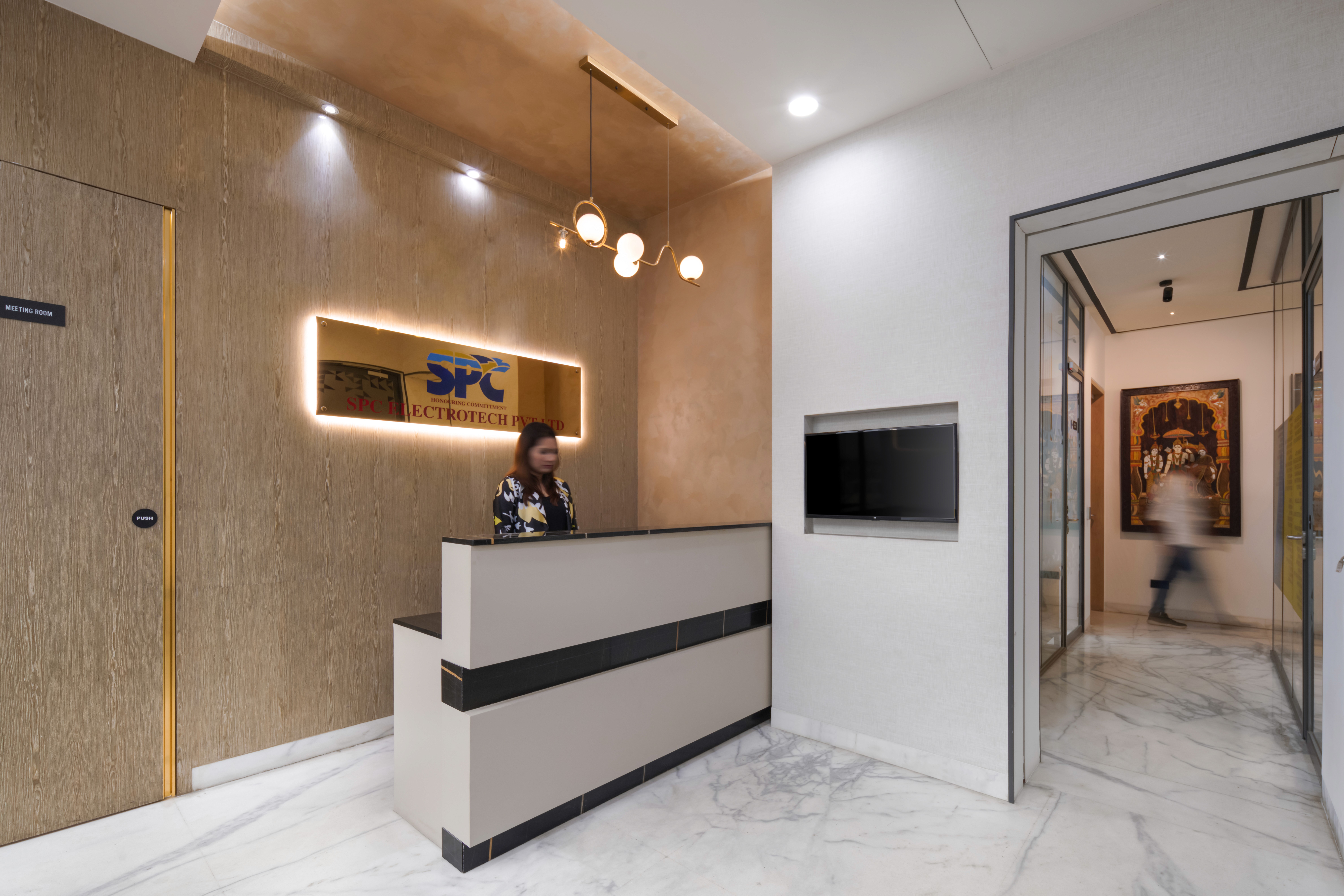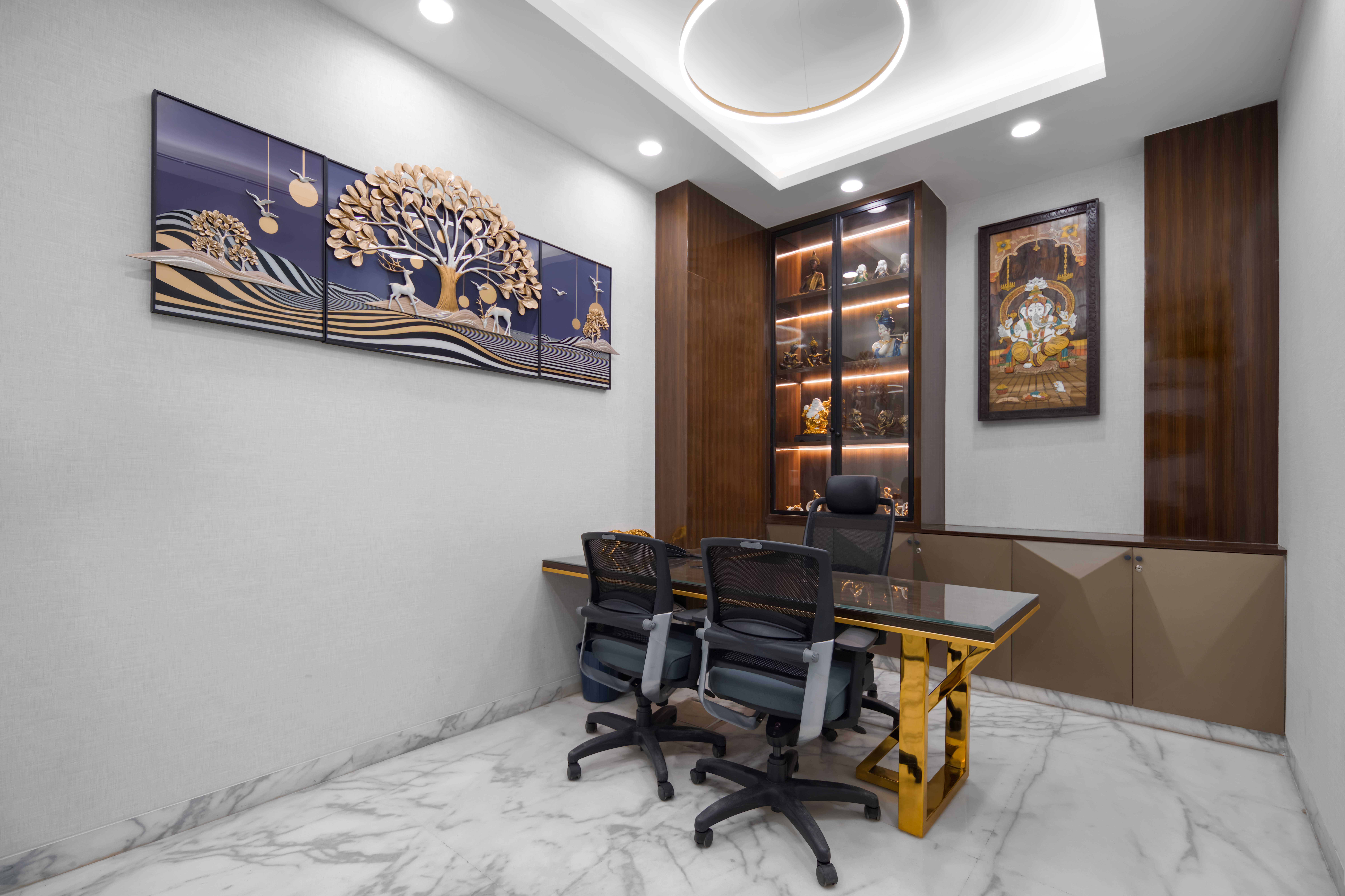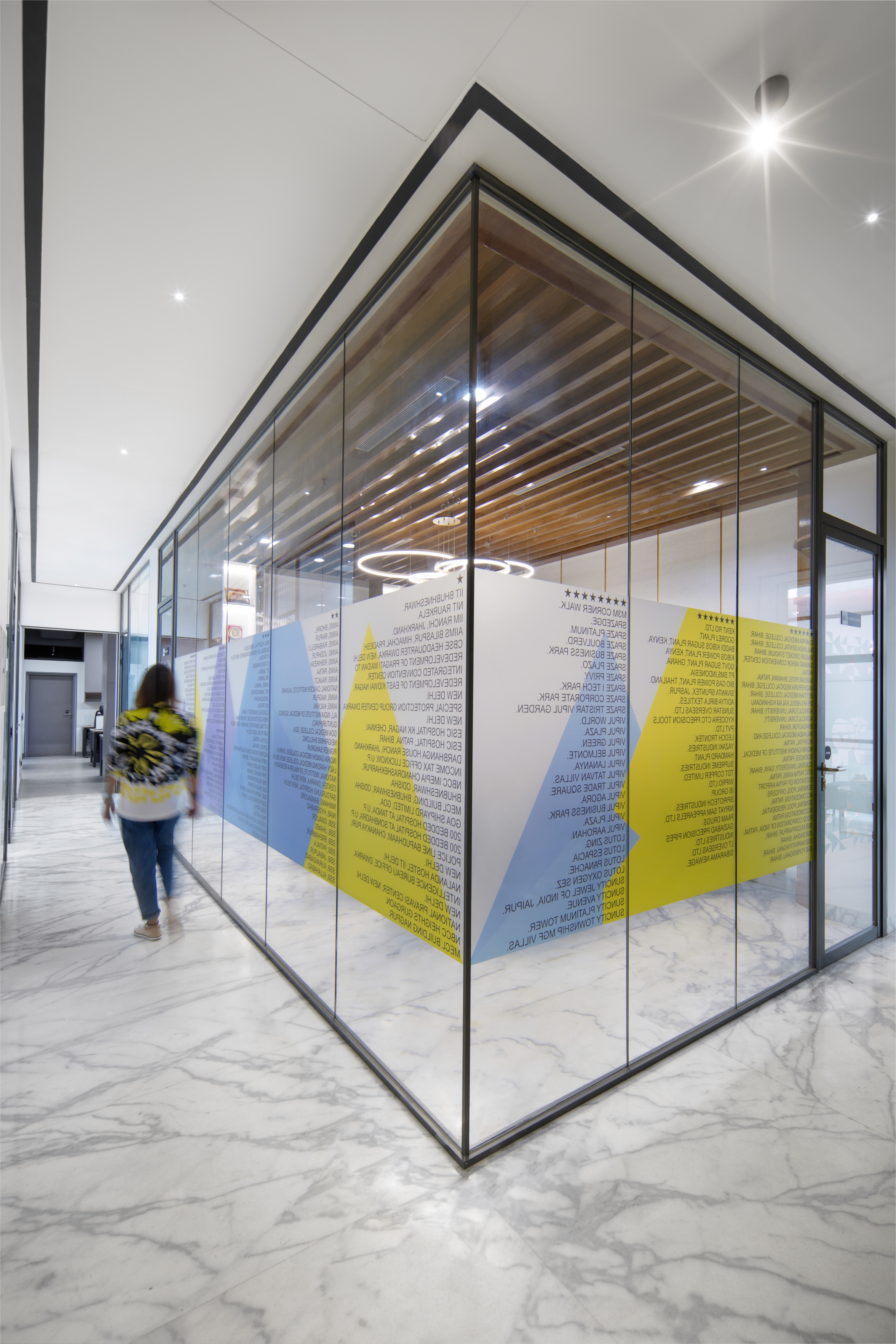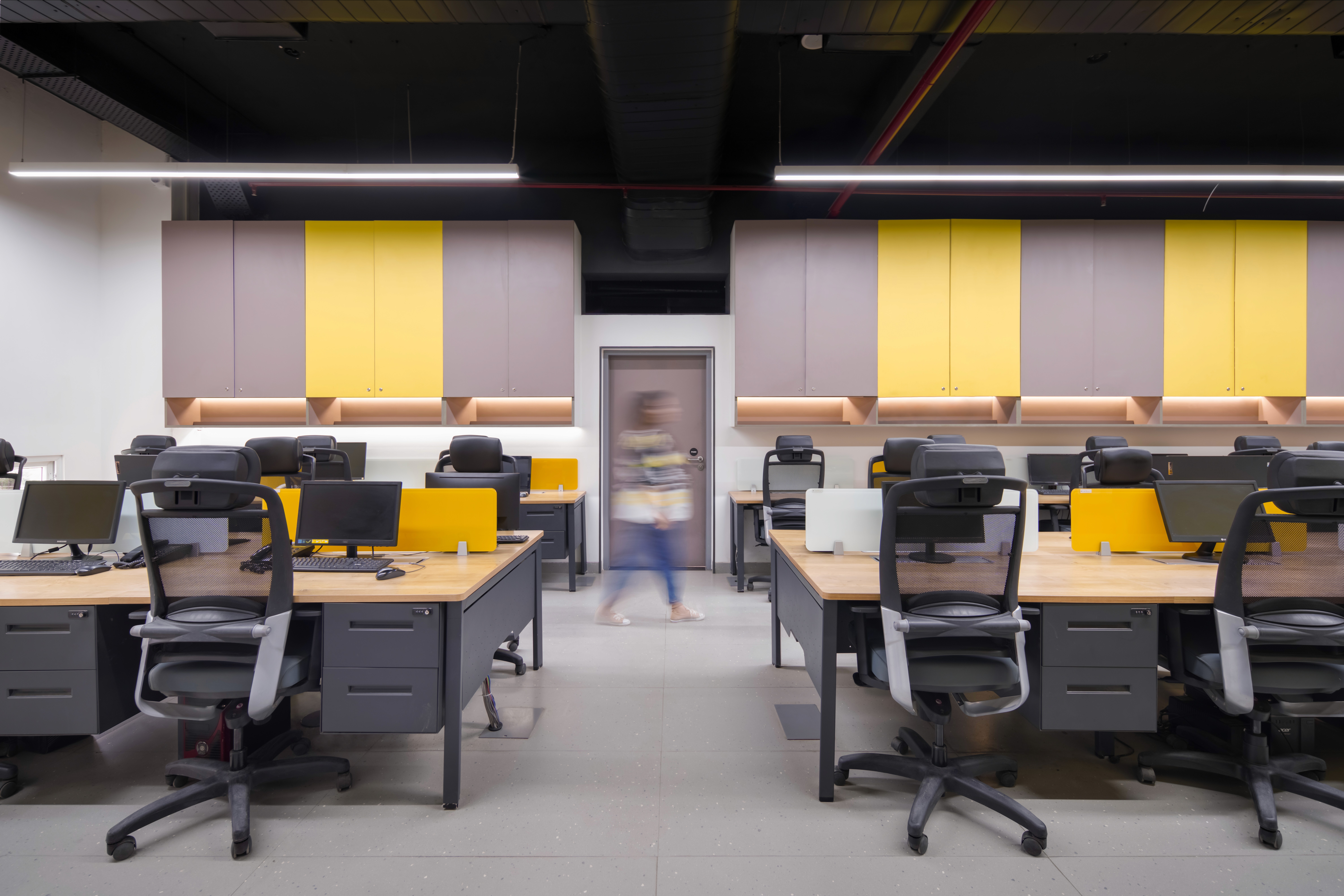 A linearity of vibrant tones & colours are used across the transition space leading to working stations in this Delhi NCR office.