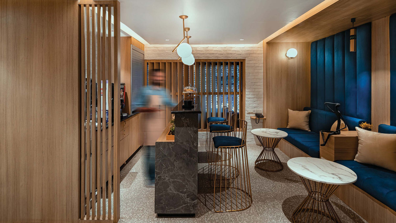 Showcasing an experimentation of a variety of finishes and materials, Ping Pong is a curated display of various interior design elements. The calming beige tones in an assortment of textures blend in seamlessly together while pops of royal blue highlight the bold luxury of the designed spaces. An air of sophisticated and unchanging elegance is lent to the entire space with the employment of feature walls showcasing some of the client’s imported finishing products. The office space radiates an understated neo-classical vibe with imperial elements interwoven with wooden panels and bright gold accents. With a strong overlying theme for the entire design, the experiential quality of the spaces has been heightened