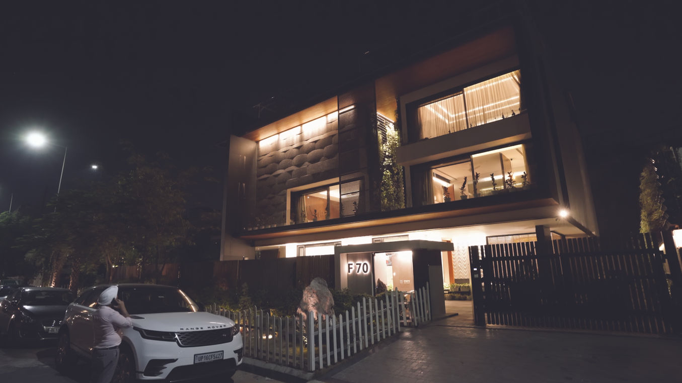 Located in Noida, a satellite city in the national capital region, this residence is an epitome of elegant modern architecture. With a simple yet enormously posh moving façade, transparent glass walls and wide entrance made of an articulated revolving door, the residence gives you a sense of freedom and class. The see through shell and large balconies create spaces that reach out to the outdoors creating an alluring engagement with nature. Concrete, glass and wood have been beautifully blended together in this home and sets a subtle and classy aesthetic right from the first look while light animates and constantly changes the visual impact of the space.